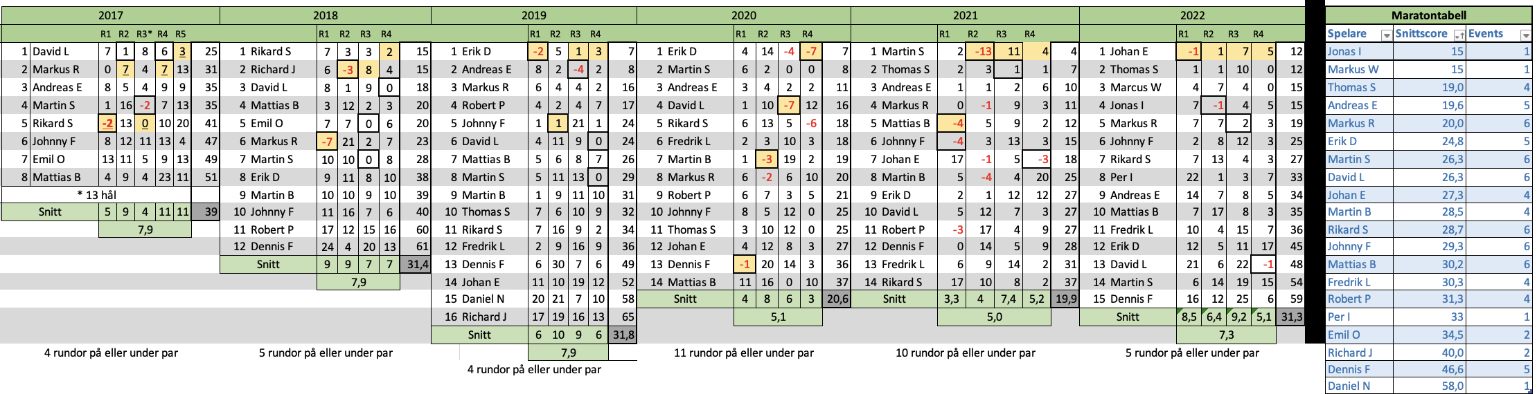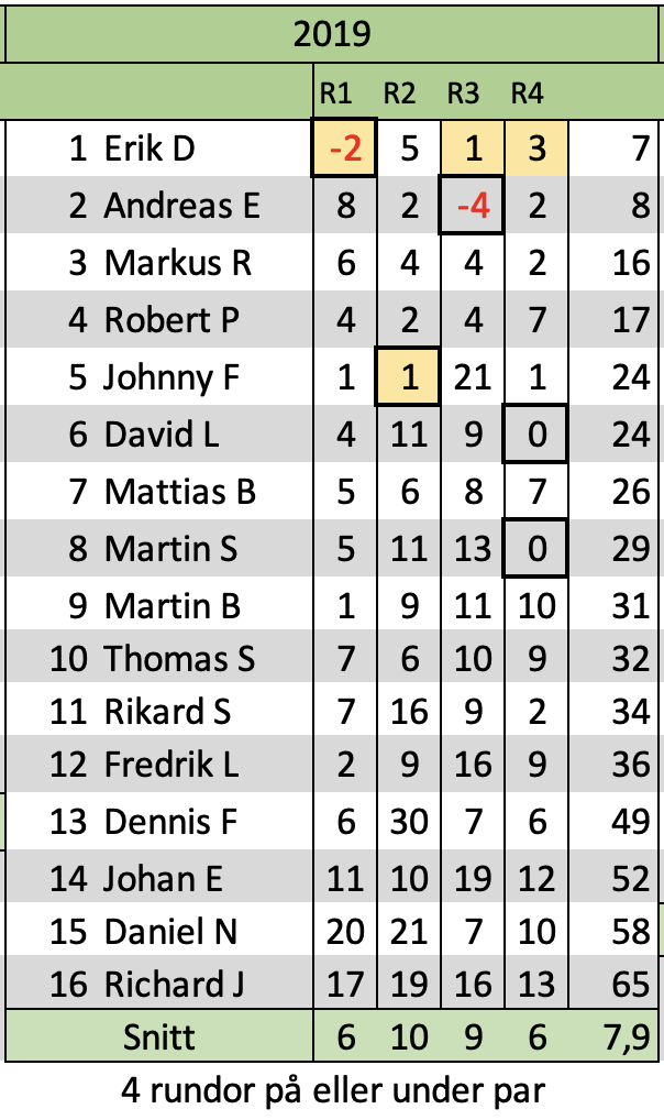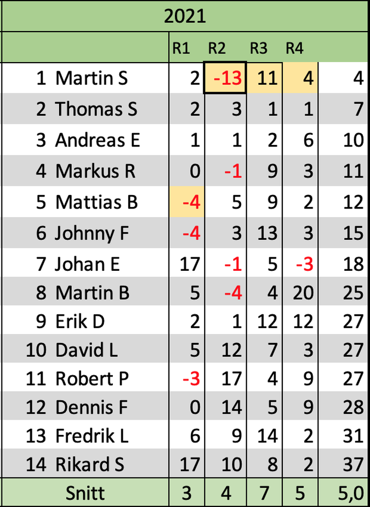 Bästa rundan i snitt presterades när kropparna var som tröttast. +5,3 i snitt och en ganska rejäl revansch för några golfare! De som spelade bäst för dagen och toppade den avslutande individuella poängbogeyn var Lawa (-1) Willer (E) och Thomas (E).