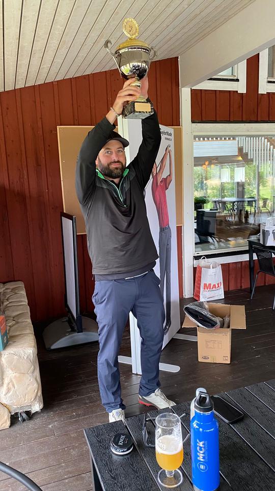 Huvudtävlingen då? Jo det blev spännande hela vägen in där Thomas och Willer hämtat upp några slag på Johan och herrarna Stjernlöf och Ekström låg faktiskt helt lika inför sista hålet när Johan plötsligt hookar ut sin driver rejält! Thomas i vanlig ordning i fairway.... men kort..... Johan hittar mirakulöst sin boll och kan knacka ut den och slå upp sitt tredjeslag höger om green. Thomas når inte upp med sitt andraslag och Johan slår en fin chip och har en 1,5-metare för bogey. Thomas tittar länge på sin ca 8-meters för par och CI-vinst men lyckas inte få den att rulla i. Johan håller nerverna i styr och sänker, liksom Thomas, sin bogeyputt och det räcker för att vinna titeln. Samma resultat men lägre hcp avgör! Rafflande som sagt!